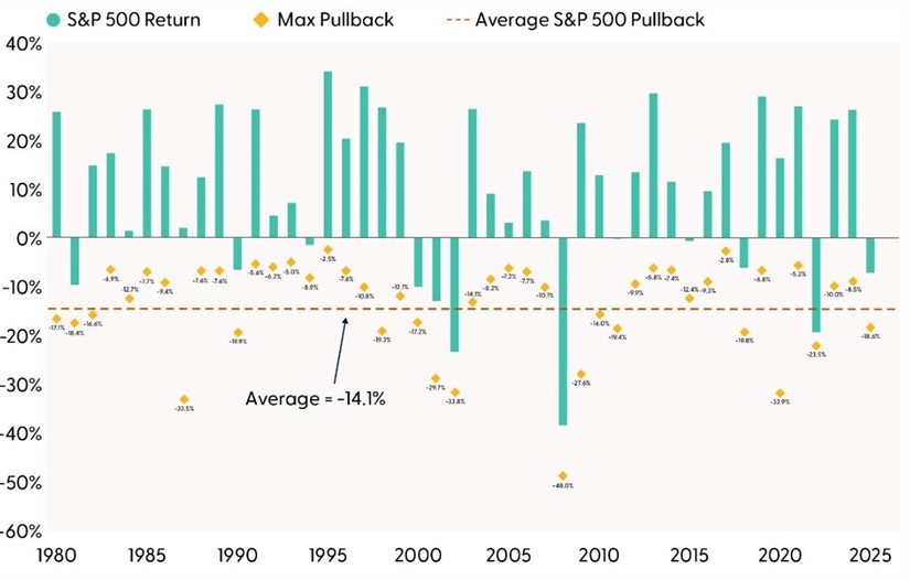 Whenever the stock market is volatile, we think it’s helpful for investors to study market history. To help, we have included one of our favorite charts. The “Big Drawdowns Turning Into Annual Gains Is Not Very Unusual” chart highlights the maximum drawdown in each year (diamond markers, average is 14%) and compares those drawdowns to annual returns (aqua colored bars, average +10%).